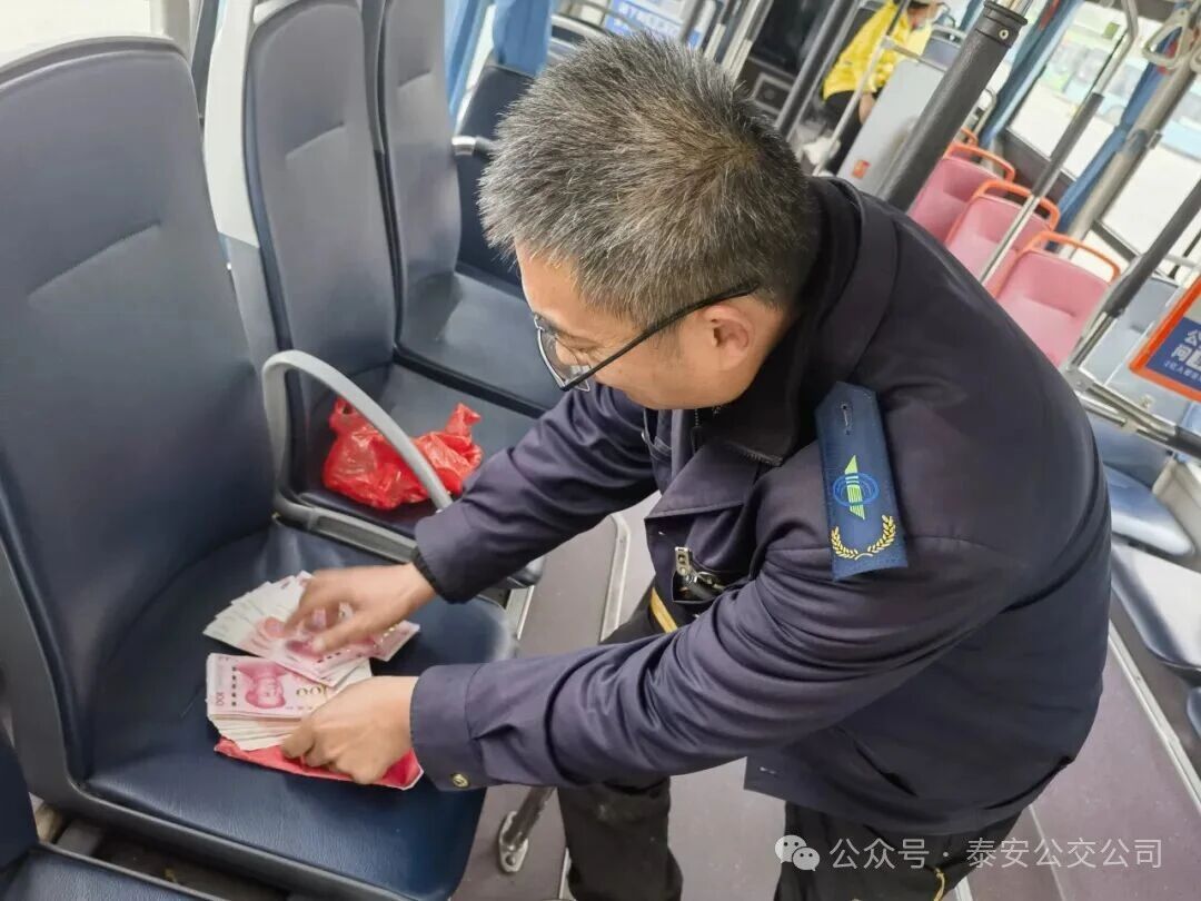 當天下午,駕駛員公鵬如往常一般,駕駛魯J08381D號公交車從山東第一醫(yī)科大學(xué)老校站出發(fā),駛向南高新區(qū)公交停車場。1402分,車輛行至泰山火車站廣場站點時,一名剛上車的乘客在后排座位發(fā)現(xiàn)一個不起眼的紅色塑料袋,打開后竟看到一沓厚厚的百元現(xiàn)金。